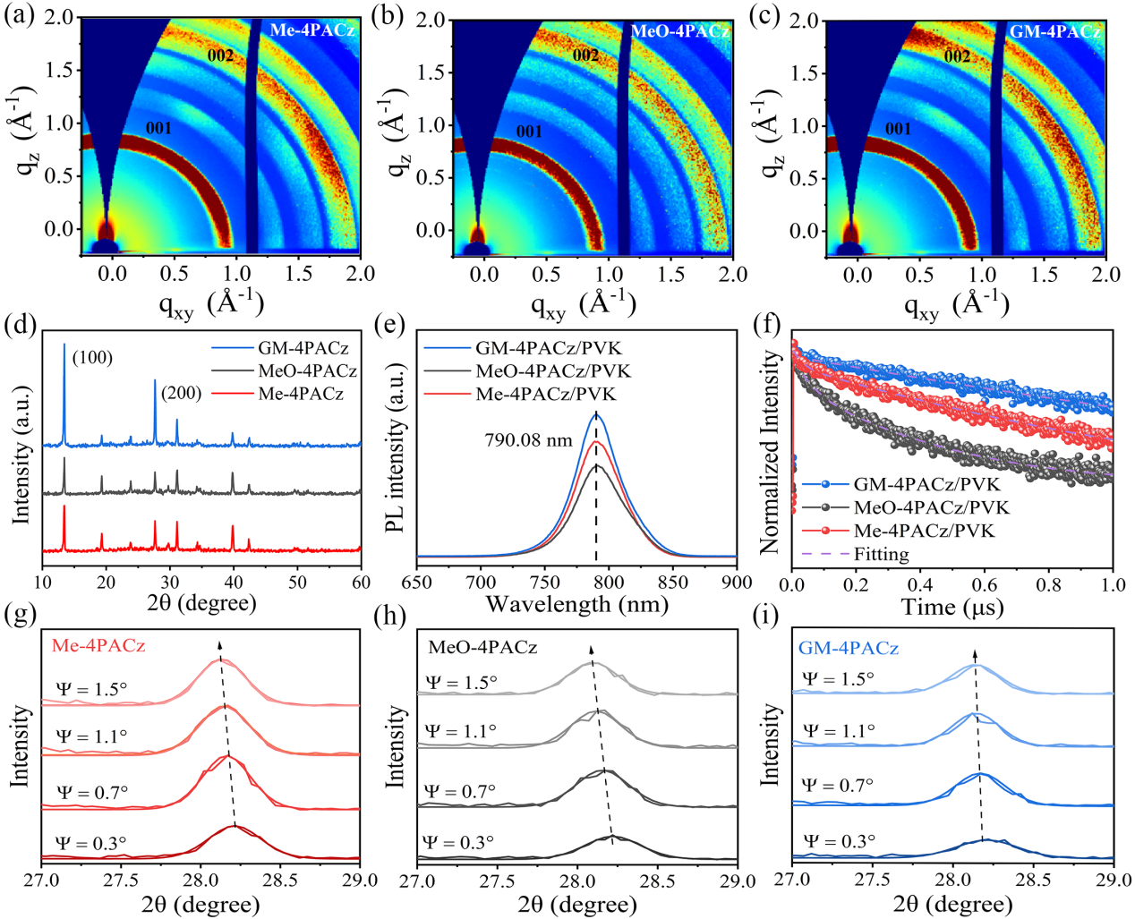 图1. a)Me-4PACz、b)MeO-4PACz和c)GM-4PACz衬底上钙钛矿薄膜的GIWAXS图像。d)ITO/Me-、MeO-和GM-4PACz衬底上钙钛矿薄膜的XRD图谱,e)稳态PL,f)TRPL光谱。g)ITO/Me-4PACz、h)ITO/MeO-4PACz和i)ITO/GM-4PACz 衬底上的钙钛矿薄膜的GIXRD光谱。图片来源:Angew. Chem. Int. Ed