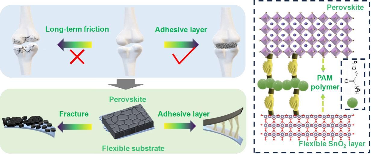 柔性钙钛矿太阳电池(F-PSC)正在迅速崛起,成为重量敏感、可穿戴、便携以及柔性应用领域中极具前景的解决方案。然而,由于层间附着力弱和应力不匹配,导致柔性钙钛矿太阳电池仍然存在机械稳定性差的问题。