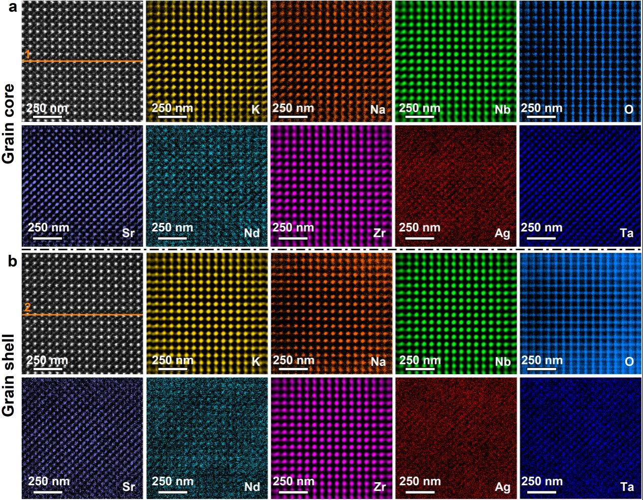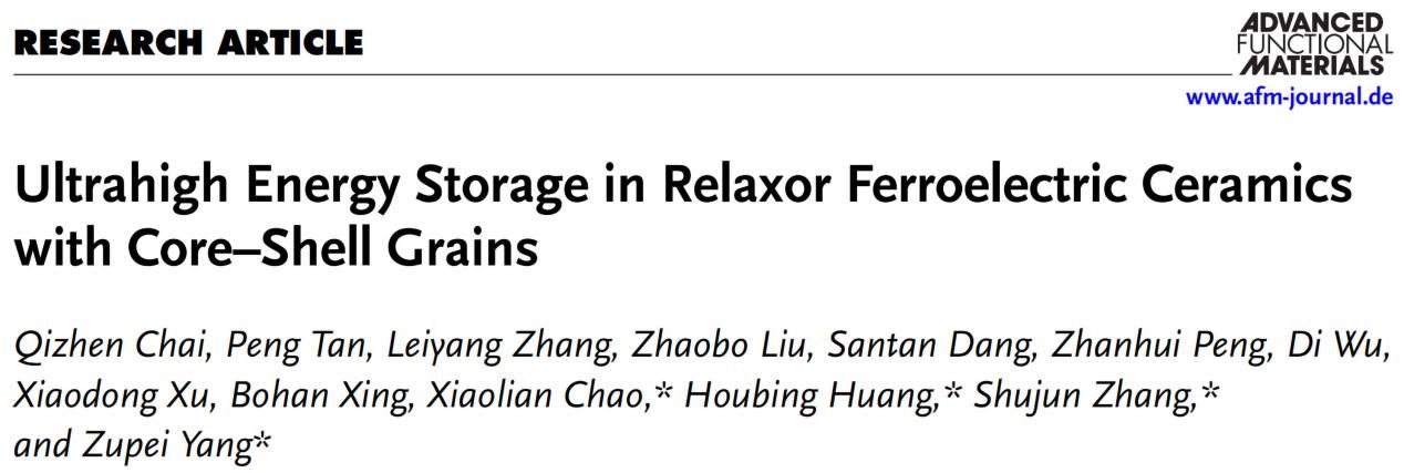 近日,公司铁电功能材料与器件创新团队杨祖培教授团队联合澳大利亚伍伦贡大学、哈尔滨工业大学、北京理工大学、西安交通大学等高校在《Advanced Functional Materials》(先进功能材料)上发表题为“Ultrahigh energy storage in relaxor ferroelectric ceramics with core-shell grains”(核壳结构弛豫铁电陶瓷的超高能量存储性能)的研究论文。论文基于第一性原理计算和相场模拟,提出了局部成分梯度结构设计理念,构建了核-壳结构,形成了多态极性纳米微区(PNRs)共存的异质结构,平衡了Eb与∆P之间的矛盾,实现了储能性能显著提升,为新一代高性能储能介质电容器提供了有效备选材料,也为进一步探索陶瓷材料储能性能与结构演化之间的关联性提供了新思路。