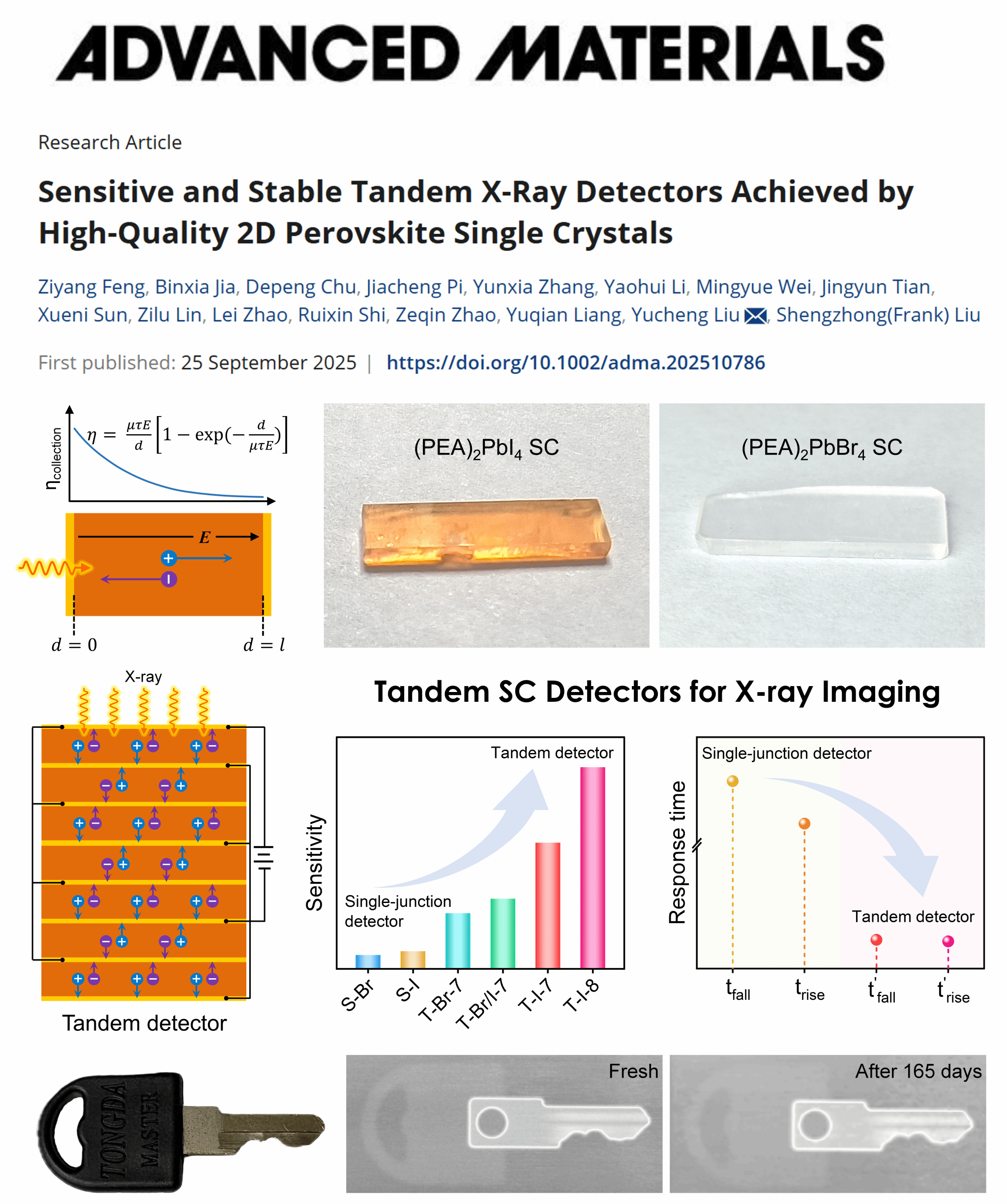 公司钙钛矿材料与器件团队结合2D单晶的层状结构易剥离特性,首次设计并组装了叠层X射线探测器。该探测器通过“分层同步收集”策略构建高效的跨层电荷传输通道,实现“纵向短程传输”机制,缩短了载流子传输距离,减少了复合和缺陷捕获,从而显著提高了载流子收集效率。因此,基于2D单晶组装的叠层X射线探测器不仅保持了低暗电流,而且比单结探测器显示出更高的响应电流,从而实现了5218 µC Gy−1 cm−2的高灵敏度,2.2 nGy s-1的低探测限,以及1.8 ms的短响应时间。此外,叠层探测器在累计剂量为2.4 Gy的强X射线连续照射后仍能保持原有的响应。高稳定性和高灵敏度结合使叠层探测器实现了12.5 lp mm−1的高清晰度X射线成像。这项研究为开发低成本、高性能X射线成像系统提供了一种新的技术方案。该工作近日发表于国际材料学知名期刊《Advanced Materials》上。
