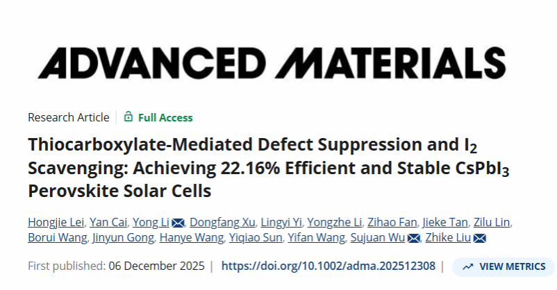 该工作得到了陕西省杰出青年学者科学基金(2025-JC-JCQN-004)、广东省光学信息材料重点实验室以及广州的科技与科技项目(202201000008)、英国365公司官网中央大学基金会(GK202302005)以及青年科学家创新项目英国上市公司365(2024YSIP-MSE-SNNU002)等项目支持。相关成果以“Thiocarboxylate-Mediated Defect Suppression and I2 Scavenging: Achieving 22.16% Efficient and Stable CsPbI3 Perovskite Solar Cells”发表于国际著名期刊《Advanced Materials》,公司2023级硕士研究生雷宏杰为第一作者,通讯作者为李永讲师、吴素娟副教授和刘治科教授(论文链接:http://doi.org/10.1002/adma.202512308)。