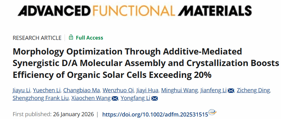 有机太阳能电池凭借轻质、柔性、低成本及大面积制备等独特优势,成为下一代光伏技术的核心候选之一。近年来,随着给体/受体分子设计与器件工程的持续进步,其光电转换效率已突破20%,展现出广阔的商业化前景。然而,体异质结活性层的形貌调控仍是制约器件性能进一步提升的关键瓶颈,聚合物给体与小分子受体之间存在显著的结构和物化性能差异,导致薄膜形成过程中易出现聚集失配、相分离失控及垂直组分分布不均等问题,严重影响电荷传输效率并加剧复合损耗。
