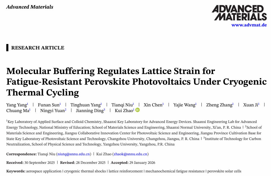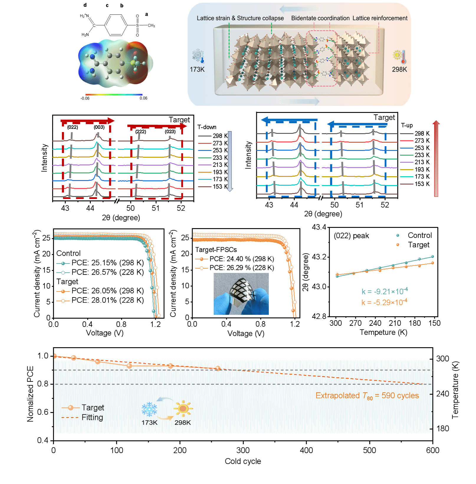 针对这一关键挑战,公司赵奎教授团队深入探究了钙钛矿电池在173 K至298 K范围内的低温循环老化机制。研究发现,快速温度循环下的持续老化过程会加剧晶格畸变,恶化不同晶面间的非对称性形变和晶格应力,在薄膜内形成大量的裂痕和孔洞,加剧陷阱密度以及位错缺陷,造成器件的快速衰减。通过引入高极性的双齿锚定甲磺酰苯甲脒分子,借助离子键和化学配位的协同配位,强化钙钛矿晶格机械韧性,抑制晶界密度,可有效降低温度循环下的晶格扰动,更好地维持钙钛矿结构及组分的稳定性。最终,优化器件在298K下实现26.05%的效率(认证值25.94%),在228 K下实现了里程碑式28.01%的低温效率,低温柔性电池效率超过26%。更为重要的是,298-173 K的温度区间内连续循环260次后,优化器件仍能维持初始效率的90%以上,寿命较参比器件提升超过3倍,极大拓展了钙钛矿光伏技术的应用边界,使其在高空探测卫星、高轨道航天器、极地或高海拔地区地面电站等面临巨大温度挑战的场景中具备了强大的应用潜力。相关成果以“Molecular Buffering Regulates Lattice Strain for Fatigue-Resistant Perovskite Photovoltaics under Cryogenic Thermal Cycling”发表于国际著名期刊《Advanced Materials》。公司2022级硕士研究生杨杨、2024级硕士研究生孙福楠为共同第一作者,牛天启博士和赵奎教授为共同通讯作者(论文链接:https://advanced.onlinelibrary.wiley.com/doi/full/10.1002/adma.202519339)。