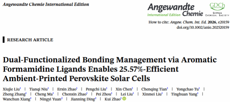 本工作为大气环境印刷制备钙钛矿光伏器件提供了一种行之有效的材料设计与结晶动力学调控方法。通过双重化学键合策略,同步解决了环境兼容性、结晶控制与薄膜放大制备难题,为推进钙钛矿光伏技术的低成本、产业化发展提供了新思路。相关研究工作以“Dual-Functionalized Bonding Management via Aromatic Formamidine Ligands Enables 25.57%-Efficient Ambient-Printed Perovskite Solar Cells”为题,发表于国际顶级期刊《Angewandte Chemie International Edition》。公司2023级硕士研究生刘秀洁为论文第一作者,牛天启博士和赵奎教授为共同通讯作者(论文链接:https://onlinelibrary.wiley.com/doi/10.1002/anie.202520159)。