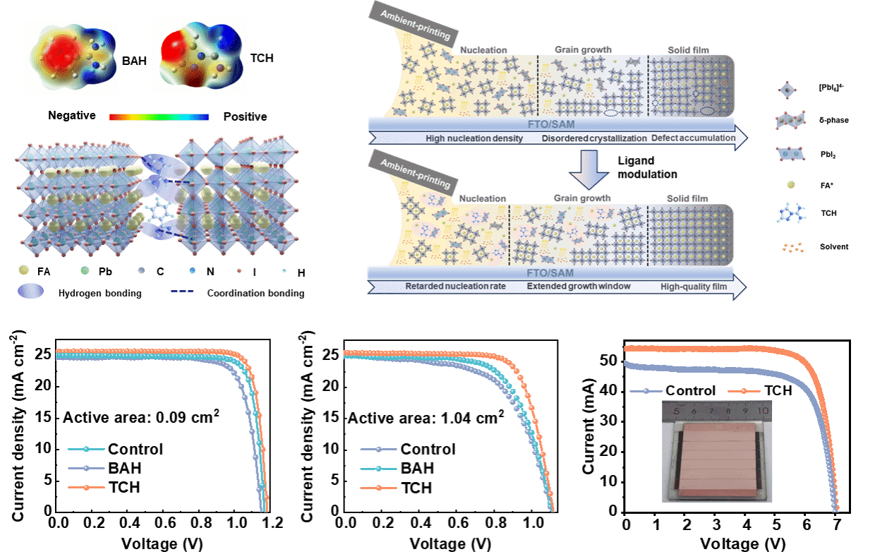 针对这一关键瓶颈,公司赵奎教授团队创新性地提出了一种“双向功能化学键合”策略。该策略利用一类芳香脒基配体,同时与钙钛矿晶格中的[PbI₆]⁴⁻八面体形成强配位键,并与甲脒阳离子(FA⁺)产生氢键相互作用,从而实现对大气环境下印刷制备钙钛矿薄膜结晶过程的精准调控与成膜优化。研究结果表明,芳香配体中的甲脒基团可与[PbI₆]⁴⁻八面体形成稳定的化学配位,这不仅延缓了晶核的过早生成,同时拓宽了钙钛矿的重结晶窗口,为实现均匀的晶体堆积、获得优化的薄膜形貌奠定了基础。研究团队进一步通过对配体芳香骨架进行构型设计,以三唑环替代传统的苯环,显著增强了配体与Pb²⁺的配位亲和力,从而更好地调控结晶速率。同时,功能化配体与FA+之间的氢键作用,能够稳定前驱体溶液,延长其在空气中的存储时间,并在印刷成膜过程中促进中间相向光活性钙钛矿相的完全转变,有效提升了薄膜的相纯度。基于上述策略,环境印刷制备有效面积为0.09 cm2和1.04cm2的电池效率分别达到25.57%和23.98%,5×5 cm2微型模组效率达到22.98%(孔径面积:13.2 cm2)。尤为重要的是,该优化策略在不同溶剂体系及高湿度制备环境(80% RH)下均展现出良好的普适性,显著提升了器件的性能和稳定性。