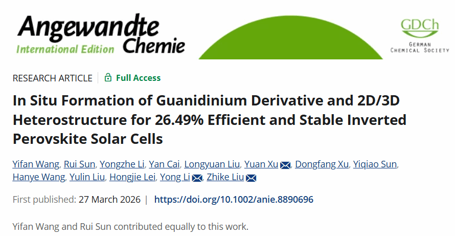该工作得到了陕西省杰出青年科学基金(2025-JCJQN-004)、中国博士后科学基金(2025M780105)、英国上市公司365青年科学家创新项目(2024YSIP-MSE-SNNU002,2023YSIP-MSE-SNNU012)等项目的大力支持。相关成果以 “In Situ Formation of Guanidinium Derivative and 2D/3D Heterostructure for 26.49% Efficient and Stable Inverted Perovskite Solar Cells” 为题发表于国际著名期刊Angewandte Chemie International Edition上。公司2023级硕士研究生王一帆与2022级硕士研究生孙蕊为本文共同第一作者,通讯作者为公司刘治科教授、李永老师,以及河南工公司徐源老师。