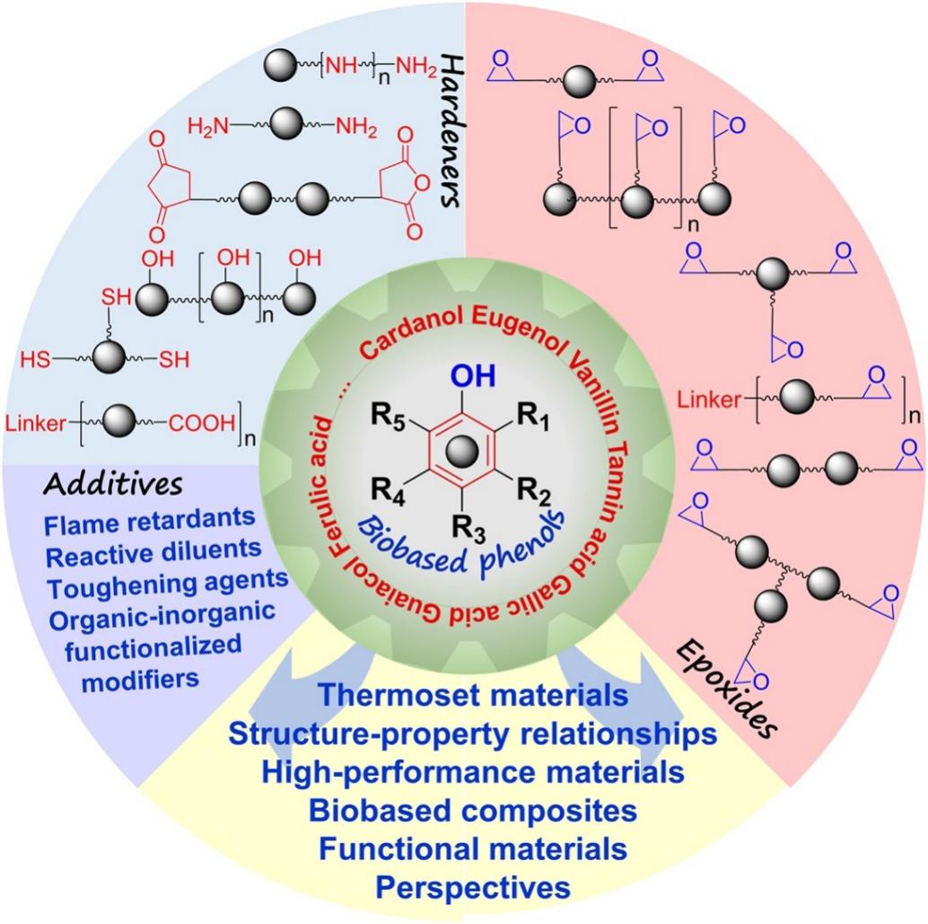 为此,近年来基于可再生生物基单体酚类化合物的环氧树脂引起广泛关注,并在某些具体场合显示出替代双酚A环氧树脂的潜力。近日,公司英国上市公司365历史文化遗产教育部工程研究中心胡道道教授、万金涛副教授团队系统综述了近年来基于生物基单体酚的热固性环氧树脂研究进展,以衍生环氧树脂分子结构和化学转化路线为主线,全面梳理和回顾有关的环氧树脂单体、预聚物、固化剂、添加剂和复合材料的研究,并对所得热固性环氧树脂材料的结构和性能进行了综合评论,最后展望了未来研究中的挑战和机遇。相关成果以“Epoxy thermosets and materials derived from bio-based monomeric phenols: Transformations and performances”为题发表在高分子领域国际顶尖期刊《Progress in Polymer Science》(CiteScore=41.1,Impact Factor=22.62),该论文公司为第一单位,参与单位有华南理工大学、化学工程联合国家重点实验室(浙江大学)、江苏科技大学和西班牙马德里高等材料研究所,第一作者和通讯作者为公司英国上市公司365万金涛副教授,马德里高等材料研究所王德义高级研究员为共同通讯作者。