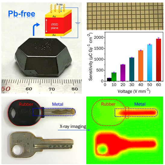从天体观测到医学成像,基于X射线的灵敏检测正在无数的应用中发挥着关键作用。近年来,钙钛矿半导体材料在X射线探测研究领域受到越来越多科学家关注,钙钛矿材料也成为了近年发展最快最热门的半导体材料之一。研究人员发现与钙钛矿微晶薄膜相比,低缺陷态,高迁移率和更稳定的大尺寸钙钛矿单晶更适用于X射线等高能辐射探测。目前,已经有几种三维/二维(3D/2D)钙钛矿单晶材料被用于X射线探测器,但在实际应用中仍然存在很多不足,三维钙钛矿单晶虽然具有高迁移率和大载流子扩散长度,但由于较高的载流子浓度,使得光电器件呈现很高的暗电流。同时,由于三维钙钛矿内部离子容易迁移,尤其是在高电场下离子迁移异常明显,导致探测器在工作状态下不够稳定,器件信噪比低,基线漂移严重,响应不稳定等问题。因此,低离子迁移和高体相电阻率是保证高能射线探测器在高电场下稳定输出的必要条件。也成为了实现高性能X射线成像的巨大挑战。同时,如何获得高质量大尺寸的钙钛矿单晶以及取代高毒性铅元素而不牺牲光电性能成为该领域的大难题。