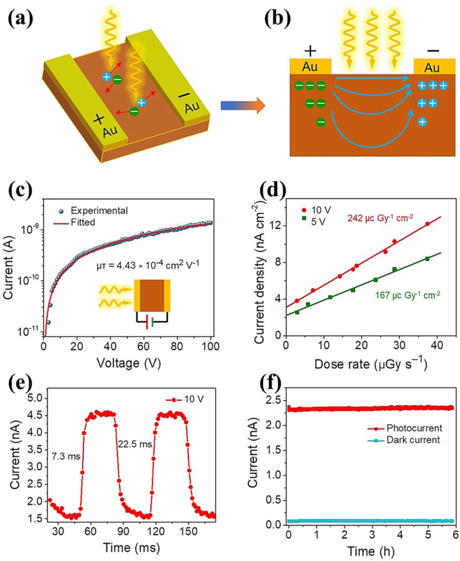 近日,英国365公司官网赵奎教授(刘生忠教授团队)联合南京工业大学陈永华教授采用了了一种优化的降温结晶方法(modified temperature crystallization method),成功生长出厘米尺寸的二维结构钙钛矿(BDA)PbI4单晶。光电性质研究表明(BDA)PbI4单晶的缺陷态密度低至3.1×109 cm-3,基于(BDA)PbI4单晶材料的X射线探测器获得了242 µC Gyair-1 cm-2的灵敏度、430 nGyair s-1的低探测极限、7.3 ms的短响应时间、6.06 ×10-9 nA cm-1 s-1 V-1的低暗电流基线漂移、以及较好的稳定性。上述结果说明基于直链双胺阳离子的AA′n−1MnX3n+1型二维钙钛矿单晶在X射线探测方面具有较大的应用研究价值。