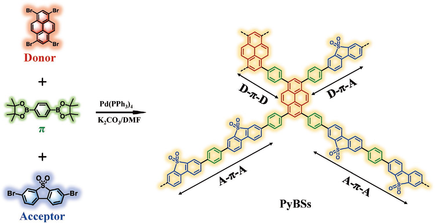 近日,公司蒋加兴教授团队通过调控芘(给体)与二苯并噻吩-S,S-二氧化物(受体)单元的摩尔比,通过统计共聚法设计合成了系列具有D-π-A结构的有机共轭聚合物光催化剂。通过引入苯桥连接及调控供体和受体的含量,提高光生电子和空穴的传输与分离,获得了具有高光催化产氢活性的有机光催化剂PyBS-3,该材料具有优异的光催化产氢性能,在紫外可见光下具有1.05 mmol·h-1的光催化产氢速率,质量归一化的产氢速率达到105 mmol·h-1·g-1。该研究工作为制备具有优异光催化分解水产氢性能的有机光催化剂提供了一条新的路径。