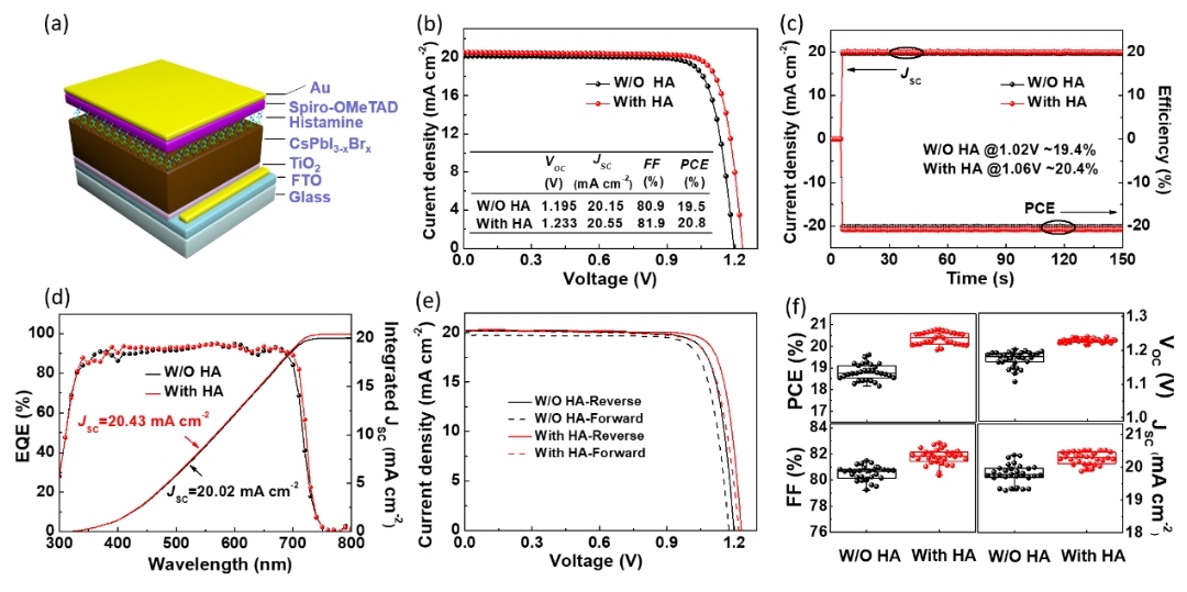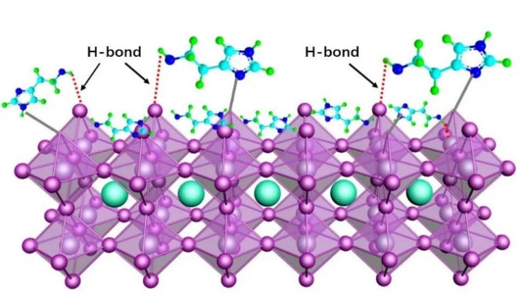 今年伊始,公司刘生忠教授团队在无机钙钛矿太阳电池效率方面取得了新进展,通过理论研究,确定组胺分子可以有效钝化钙钛矿的表面缺陷,最终将无机钙钛矿电池效率提高到当前世界记录效率(20.8%)。具体而言,选用的组胺分子含有的咪唑环是富电子基团,可以与碘空位通过路易斯酸碱反应相结合,而-NH2中的H可以与相邻的卤原子通过形成氢键相互作用,从而增强组胺分子在钙钛矿表面的附着。利用分子内不同的基团与钙钛矿表面原子的相互作用,有目的地钝化了钙钛矿表面的缺陷,从而提升了钙钛矿太阳电池的光电转换效率。