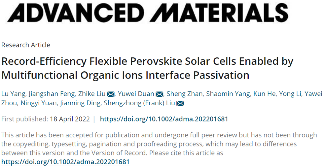 相关研究成果以题为“Record-Efficiency Flexible Perovskite Solar Cells Enabled by Multifunctional Organic Ions Interface Passivation”发表于国际顶级期刊《Advanced Materials》上。公司刘生忠教授、刘治科教授、段玉伟博士后为共同通讯作者,公司硕士研究生杨璐为第一作者。