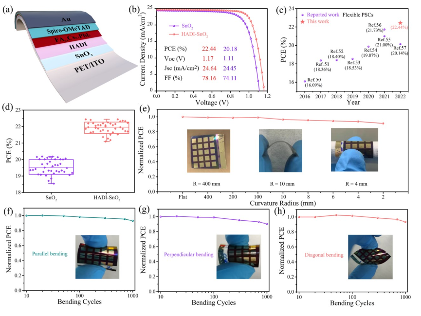 最终,基于HADI-SnO2 ETL的刚性无MA PSCs获得了24.79%的冠军光电转换效率和1.20 V的高开路电压,且具有出色的空气稳定性。无封装器件暴露在大气环境中1200小时后仍能保持其初始效率的90%以上。在此基础上,团队在低温(100°C)下制备了高质量的HADI-SnO2 ETL,并将其用于f-PSC,获得了高达22.44%的光电转化效率,这是目前f-PSCs的最高效率。