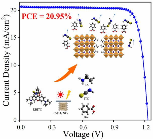 团队开发了一种光诱导调控钙钛矿结晶质量和钝化效果的新方法。采用染料---异硫氰酸罗丹明B(RBITC)作为光牺牲剂,使其在CsPbI3纳米粒子的光热催化下完全分解并原位释放出乙基铵阳离子、异硫氰酸根阴离子和苯甲酸分子,这些分子和离子可以调控钙钛矿薄膜的生长过程及钝化钙钛矿中的缺陷。乙基铵阳离子可以有效地钝化钙钛矿晶粒的表面缺陷。异硫氰酸根阴离子与未配位的Pb结合以调节结晶过程。苯甲酸分子促进了钙钛矿晶体的成核。研究结果证明提高光照可以有效加速这些有益离子/分子的释放,从而进一步提高钙钛矿薄膜的结晶质量和缺陷钝化效果。在使用RBITC进行优化后,器件获得1.24 V的高开路电压(VOC)和20.95%的冠军PCE。在25%湿度条件下储存1000小时后,未封装PSC器件的PCE保持初始效率的90.39%;在60 ℃的N2气氛中储存500小时后,PCE保持原始效率的86.02%;在连续光照条件下最大功率点跟踪100小时,PCE仍然能保持初始效率的93.6%。该工作近日发表于国际知名期刊Advanced Functional Materials上。