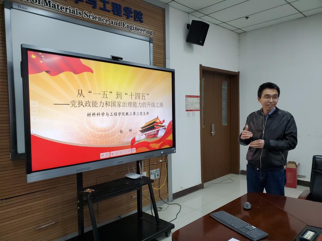 教师第一党支部书记石峰讲授党课的题目是《历史烛照时代 榜样传承精神》,通过四位在不同岗位做出突出贡献的优秀党员的先进事迹,展示了党员应有的时代风范和精神;教师第二党支部书记王强以延安精神及时代价值为主题,对延安精神的形成、内涵和时代价值展开了论述;教师第三党支部书记赵桦从“一五”到“十四五”规划的内容为切入点,讲述了我们党执政能力和治理能力的不断提升的过程。本科生党支部书记何文曦以中国共产党入党誓词的历史沿革为主线,叙述了从建党之初到现在,不同阶段的党员以怎样的座右铭作为自己的行动指南,终身践行。