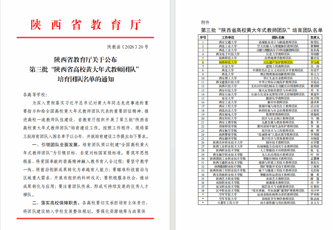 近日,陕西省教育厅公布了第三批“陕西省高校黄大年式教师团队”培育名单,公司李玉虎教授负责的“文化遗产保护教师团队”成功入选。