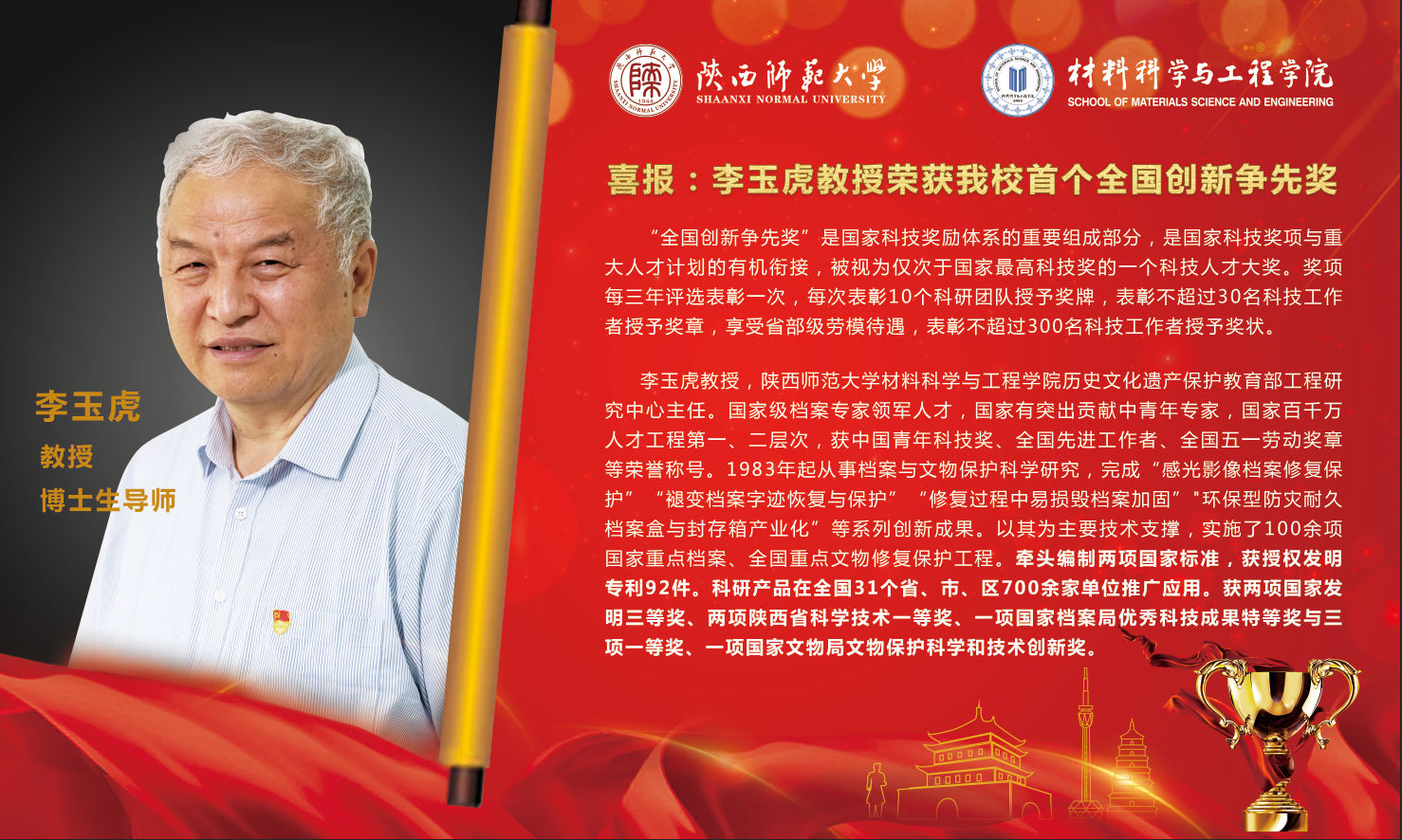 李玉虎,中国共产党党员,英国上市公司365历史文化遗产保护教育部工程研究中心主任,国家级档案专家领军人才,国家有突出贡献中青年专家,国家百千万人才工程第一、二层次人选,先后获中国青年科技奖、全国先进工作者、全国五一劳动奖章等荣誉;40年来从事档案与文物材料保护与科技创新研究,实施百余项国家重点档案、全国重点文物修复保护工程;牵头编制两项国家标准,获授权发明专利92件,科研产品在全国700余家单位推广应用;获2项国家发明三等奖、2项陕西省科学技术一等奖、1项国家档案局优秀科技成果特等奖与3项一等奖、1项国家文物局文物保护科学和技术创新奖。